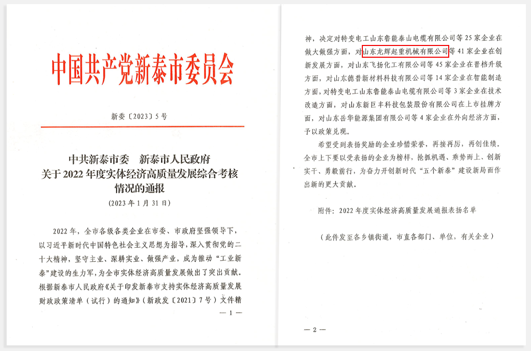 此次獲得多項(xiàng)殊榮,既是對龍輝起重全體職工一整年辛勤勞作的工作成果的褒獎(jiǎng),也包含著市委、市政府對龍輝起重的殷切期望。
