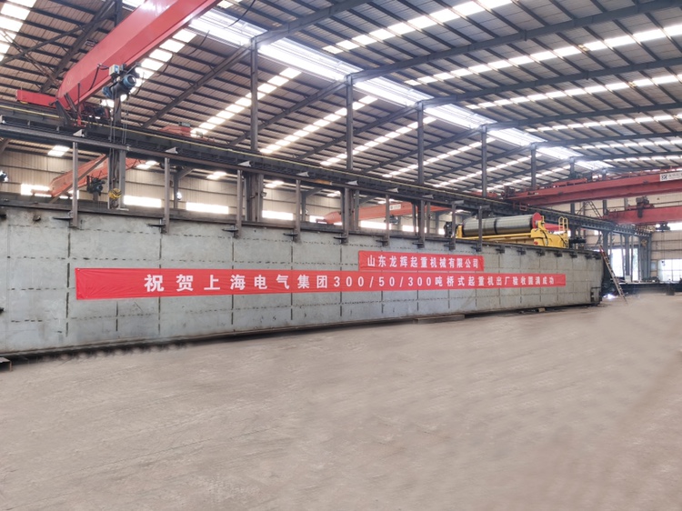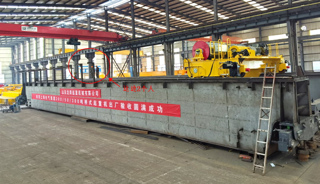 龍輝起重集團(tuán):為上海電氣集團(tuán)設(shè)計(jì)生產(chǎn)的300+300/50噸橋式起重機(jī)順利通過廠內(nèi)驗(yàn)收,大噸位歐式標(biāo)準(zhǔn)起重機(jī),箱高超3米,跨度33.5米,有效起升高度22米。